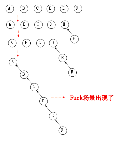 最坏情况下我们进行M次的Union时会存在这样的一个链表的场景。