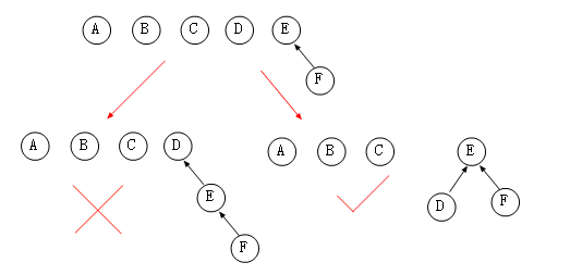 将小树作为大树的孩子节点存在,最终也就降低了新树的深度,比如图中的Union(D,{E,F})的时候可以做出如下修改。