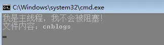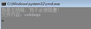 1 static void Main(string[] args) 2 { 3 var path = "C://1.txt"; 4 5 FileStream fs = new FileStream(path, FileMode.Open); 6 7 FileInfo info = new FileInfo(path); 8 9 byte[] b = new byte[info.Length]; 10 11 var asycState = fs.BeginRead(b, 0, b.Length, (result) => 12 { 13 var file = result.AsyncState as FileStream; 14 15 Console.WriteLine("文件内容:{0}", Encoding.Default.GetString(b)); 16 17 file.Close(); 18 19 }, fs); 20 21 Console.WriteLine("我是主线程,我不会被阻塞!"); 22 23 Console.Read(); 24 }