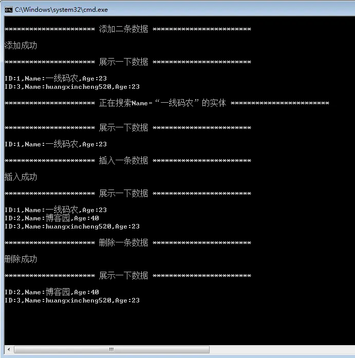 20 Console.WriteLine("\n********************** 正在搜索Name=“一线码农”的实体 ************************\n");