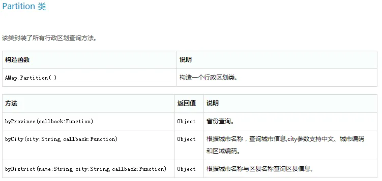 function byDistrict(){ var partition = new AMap.Partition(); //创建一个新的行政规划类 partition.byDistrict(district,city,byDistricty_CallBack); //行政规划查询 }