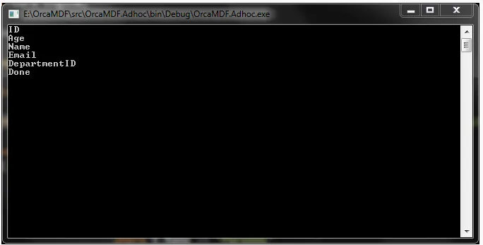 using (var db = new Database(new[] { @"C:Test.mdf" })) { var sys = db.Dmvs; var table = sys.Tables.Where(t => t.Name == "Persons").Single(); var columns = sys.Columns.Where(c => c.ObjectID == table.ObjectID); foreach (var col in columns) Console.WriteLine(col.Name); }