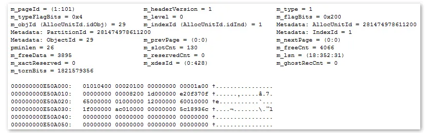 HeaderVersion = header[0]; Type = (PageType)header[1]; TypeFlagBits = header[2]; Level = header[3]; FlagBits = BitConverter.ToInt16(header, 4); IndexID = BitConverter.ToInt16(header, 6); PreviousPage = new PagePointer(BitConverter.ToInt16(header, 12), BitConverter.ToInt32(header, 8)); Pminlen = BitConverter.ToInt16(header, 14); NextPage = new PagePointer(BitConverter.ToInt16(header, 20), BitConverter.ToInt32(header, 16)); SlotCnt = BitConverter.ToInt16(header, 22); ObjectID = BitConverter.ToInt32(header, 24); FreeCnt = BitConverter.ToInt16(header, 28); FreeData = BitConverter.ToInt16(header, 30); Pointer = new PagePointer(BitConverter.ToInt16(header, 36), BitConverter.ToInt32(header, 32)); ReservedCnt = BitConverter.ToInt16(header, 38); Lsn = "(" + BitConverter.ToInt32(header, 40) + ":" + BitConverter.ToInt32(header, 44) + ":" + BitConverter.ToInt16(header, 48) + ")"; XactReserved = BitConverter.ToInt16(header, 50); XdesID = "(" + BitConverter.ToInt16(header, 56) + ":" + BitConverter.ToInt32(header, 52) + ")"; GhostRecCnt = BitConverter.ToInt16(header, 58);