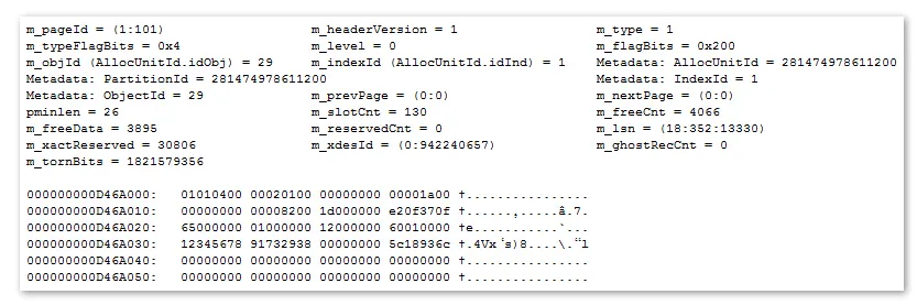 /* Bytes Content ----- ------- 00 HeaderVersion (tinyint) 01 Type (tinyint) 02 TypeFlagBits (tinyint) 03 Level (tinyint) 04-05 FlagBits (smallint) 06-07 IndexID (smallint) 08-11 PreviousPageID (int) 12-13 PreviousFileID (smallint) 14-15 Pminlen (smallint) 16-19 NextPageID (int) 20-21 NextPageFileID (smallint) 22-23 SlotCnt (smallint) 24-27 ObjectID (int) 28-29 FreeCnt (smallint) 30-31 FreeData (smallint) 32-35 PageID (int) 36-37 FileID (smallint) 38-39 ReservedCnt (smallint) 40-43 Lsn1 (int) 44-47 Lsn2 (int) 48-49 Lsn3 (smallint) 50-51 XactReserved (smallint) 52-55 XdesIDPart2 (int) 56-57 XdesIDPart1 (smallint) 58-59 GhostRecCnt (smallint) 60-95 ? */