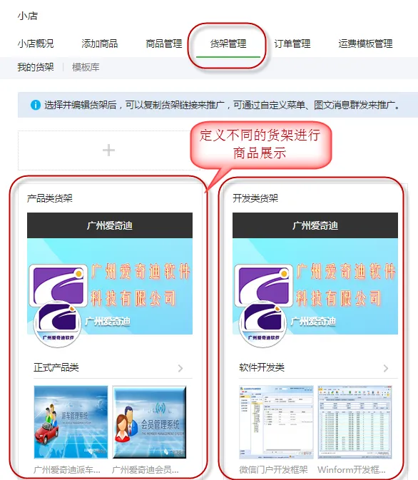 为了把商品合理的展示出来,微信小店引入了一个货架的概念,就是把商品分门别类的很好展示给客户,货架就是类似一个布局良好的展柜,我们可以定义不同的货架,然后公布不同的URL进行体验。