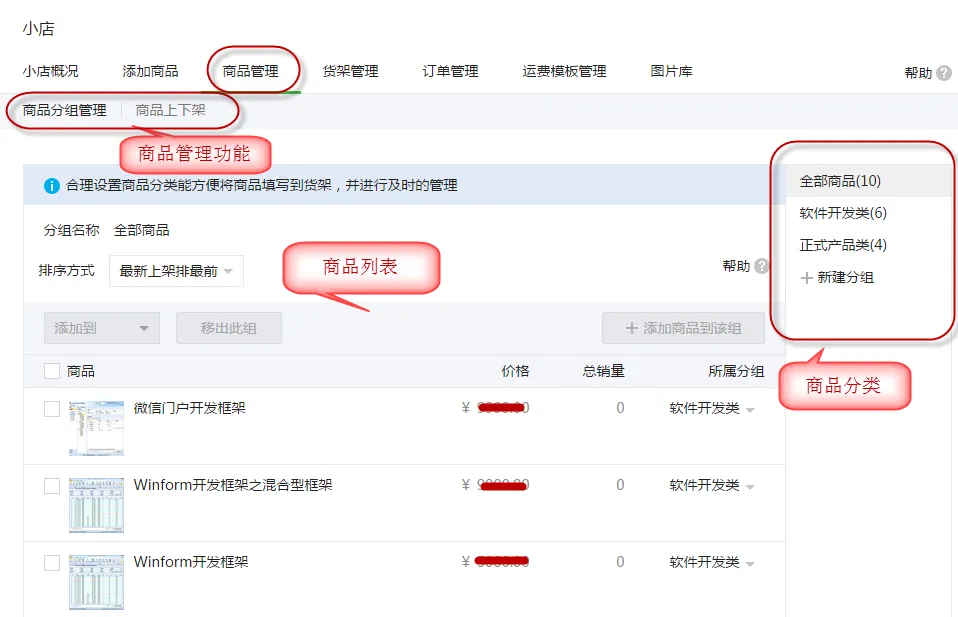 有了这些功能模块,第一步,我们就可以在微信公众号的管理平台上添加对应的商品信息,然后搭建好自己的微信店铺了。