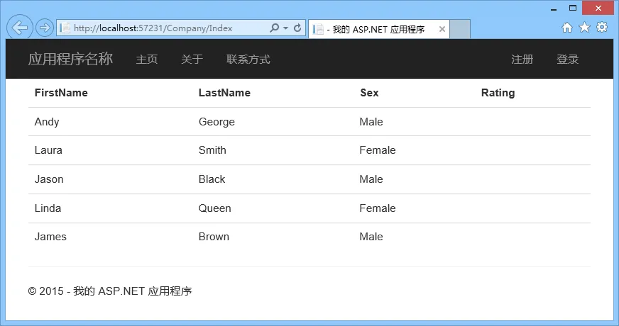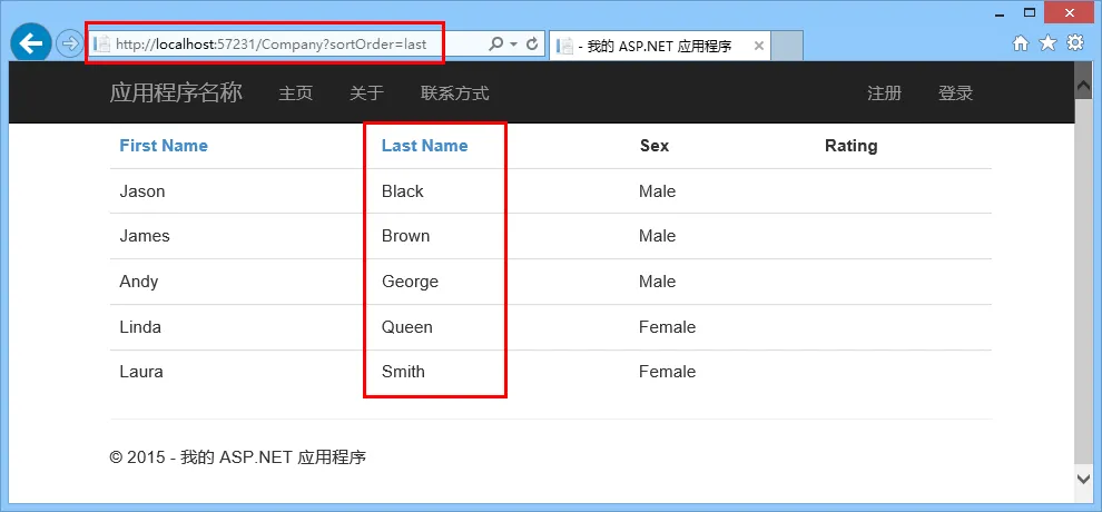 通过浏览器查看此页面。之后点击LastName链接,则按照上面代码会生成如下页面: