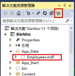 下面我们来查看数据库。如下图所示在解决方案资源管理器下面的小图标中点击显示所有文件,如图所示。然后在App_Data文件夹下就会有Employees.mdf文件。这就是EF创建的数据库文件。