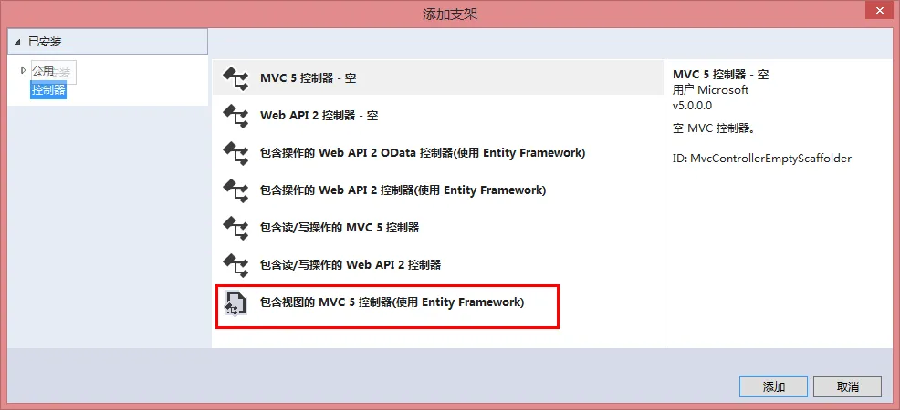 在解决方案资源管理器中右键点击Controllers文件夹选择添加->控制器,在弹出的选择支架的窗口中选择包含视图的MVC5控制器(使用 Entity Framework)。点击确定。