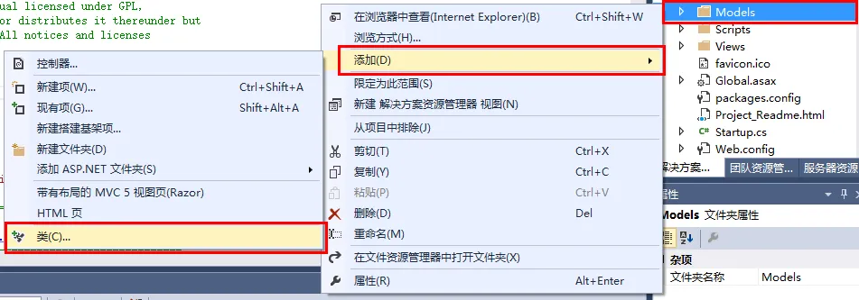 在解决方案资源管理器中右键点击Models文件夹,选择添加->类。添加一个名为Employee.cs的Model类。Models文件夹是默认存放所有Model的地方。