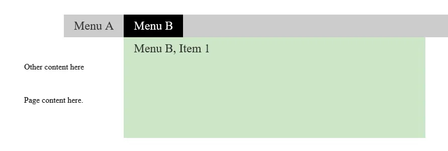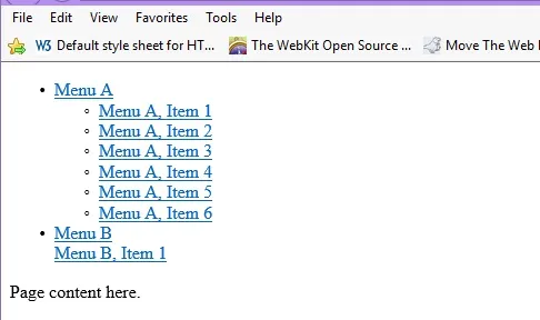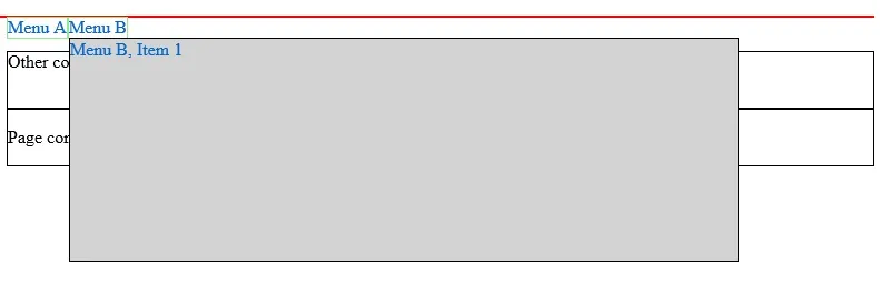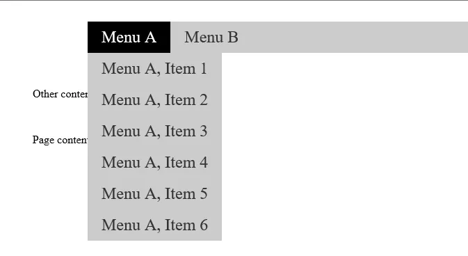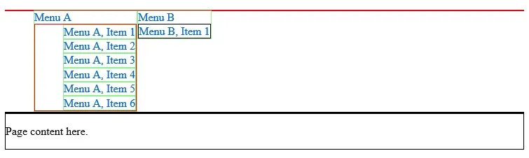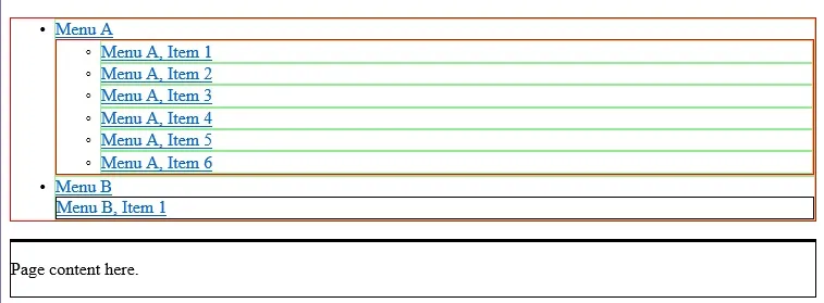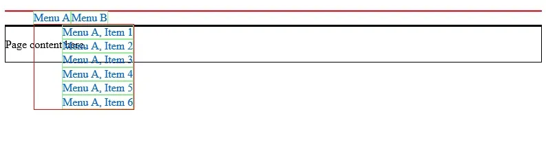 <body> <ul id="navWrapper"> <li> <a href="#">Menu A</a> <ul> <li><a href="#">Menu A, Item 1</a></li> <li><a href="#">Menu A, Item 2</a></li> <li><a href="#">Menu A, Item 3</a></li> <li><a href="#">Menu A, Item 4</a></li> <li><a href="#">Menu A, Item 5</a></li> <li><a href="#">Menu A, Item 6</a></li> </ul> </li> <li> <a href="#">Menu B</a> <div id="test"><a href="#">Menu B, Item 1</a></div> </li> </ul> <div id="banner"></div> <div id="content"> <p>Page content here.</p> </div> </body>