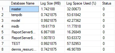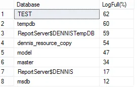 SELECT instance_name AS [Database] ,cntr_value AS [LogFull(%)] FROM sys.dm_os_performance_counters WHERE counter_name LIKE 'Percent Log Used%' AND instance_name NOT IN ( '_Total' ,'mssqlsystemresource' ) AND cntr_value > 0 ORDER BY [LogFull(%)] DESC;