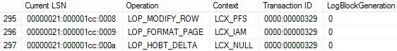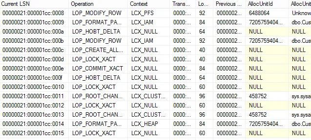SELECT [Current LSN] ,[Operation] ,[Context] ,[Transaction ID] ,[Log Record Length] ,[Previous LSN] ,[AllocUnitId] ,[AllocUnitName] ,[Page ID] ,[Slot ID] ,[Xact ID] FROM sys.fn_dblog(NULL, NULL)