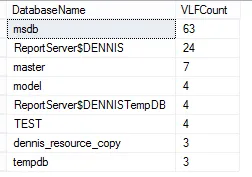 CREATE TABLE #VLFInfo ( RecoveryUnitID INT ,FileID INT ,FileSize BIGINT ,StartOffset BIGINT ,FSeqNo BIGINT ,[Status] BIGINT ,Parity BIGINT ,CreateLSN NUMERIC(38) ); CREATE TABLE #VLFCountResults ( DatabaseName SYSNAME ,VLFCount INT ); EXEC sp_MSforeachdb N'Use [?]; INSERT INTO #VLFInfo EXEC sp_executesql N''DBCC LOGINFO([?])''; INSERT INTO #VLFCountResults SELECT DB_NAME(), COUNT(*) FROM #VLFInfo; TRUNCATE TABLE #VLFInfo;' SELECT DatabaseName ,VLFCount FROM #VLFCountResults ORDER BY VLFCount DESC; DROP TABLE #VLFInfo; DROP TABLE #VLFCountResults;