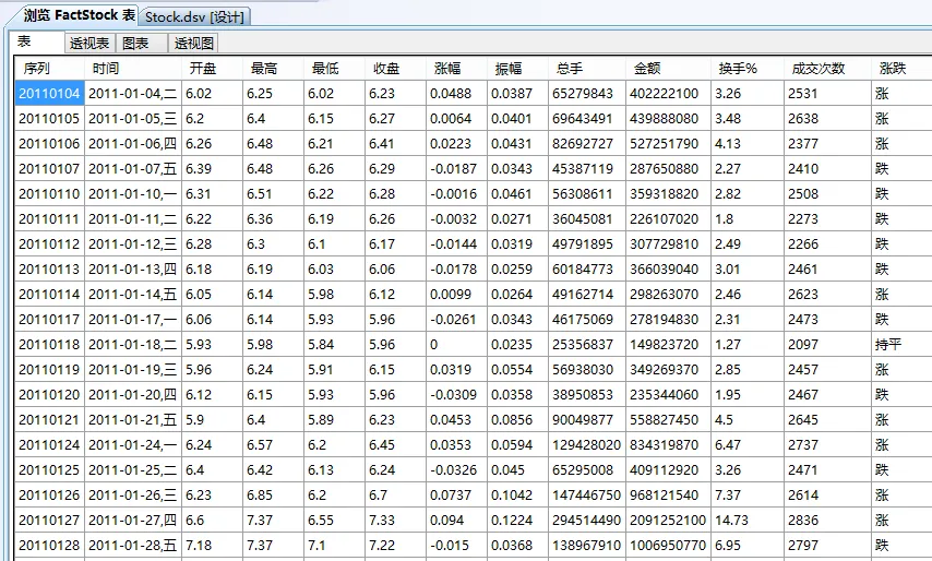 UPDATE FactStock SET [涨跌] = N'涨' WHERE [涨幅] > 0 UPDATE FactStock SET [涨跌] = N'跌' WHERE [涨幅] < 0 UPDATE FactStock SET [涨跌] = N'持平' WHERE [涨幅] = 0 SELECT [涨跌] , COUNT(*) AS Cnt FROM FactStock GROUP BY [涨跌] SELECT * FROM FactStock WHERE [涨跌] = N'持平' SELECT MAX(收盘) , MIN(收盘) , AVG(收盘) FROM FactStock UPDATE FactStock SET 序列 = CAST(REPLACE(CONVERT(CHAR(10), SUBSTRING([时间], 1, 10), 120), '-', '') AS INT) SELECT * FROM FactStock