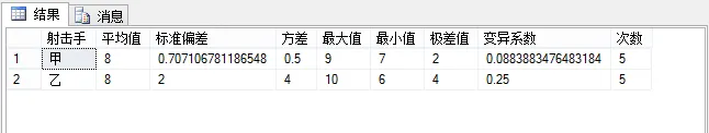 DECLARE @t1 TABLE ( Sequence INT , Name VARCHAR(20) , Score INT ) INSERT INTO @t1 SELECT 1 , '甲' , 7 UNION ALL SELECT 2 , '甲' , 8 UNION ALL SELECT 3 , '甲' , 8 UNION ALL SELECT 4 , '甲' , 8 UNION ALL SELECT 5 , '甲' , 9 UNION ALL SELECT 1 , '乙' , 10 UNION ALL SELECT 2 , '乙' , 6 UNION ALL SELECT 3 , '乙' , 10 UNION ALL SELECT 4 , '乙' , 6 UNION ALL SELECT 5 , '乙' , 8 --SELECT * --FROM @t1 SELECT Name AS '射击手' , AVG(Score) AS '平均值' , STDEV(Score) AS '标准偏差' , VAR(Score) AS '方差' , MAX(Score) AS '最大值' , MIN(Score) AS '最小值' , MAX(Score) - MIN(Score) AS '极差值' , STDEV(Score) / AVG(Score) AS '变异系数' , COUNT(Score) AS '次数' FROM @t1 GROUP BY Name