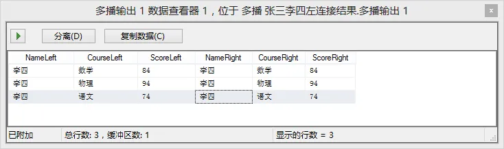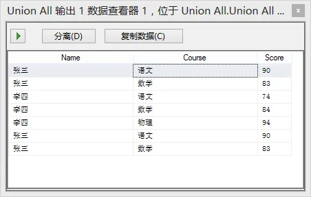 接下来,先看组件【Union All】,是【多播 张三李四】和【多播 只有张三】两个数据的内容上下合并,理论结果: