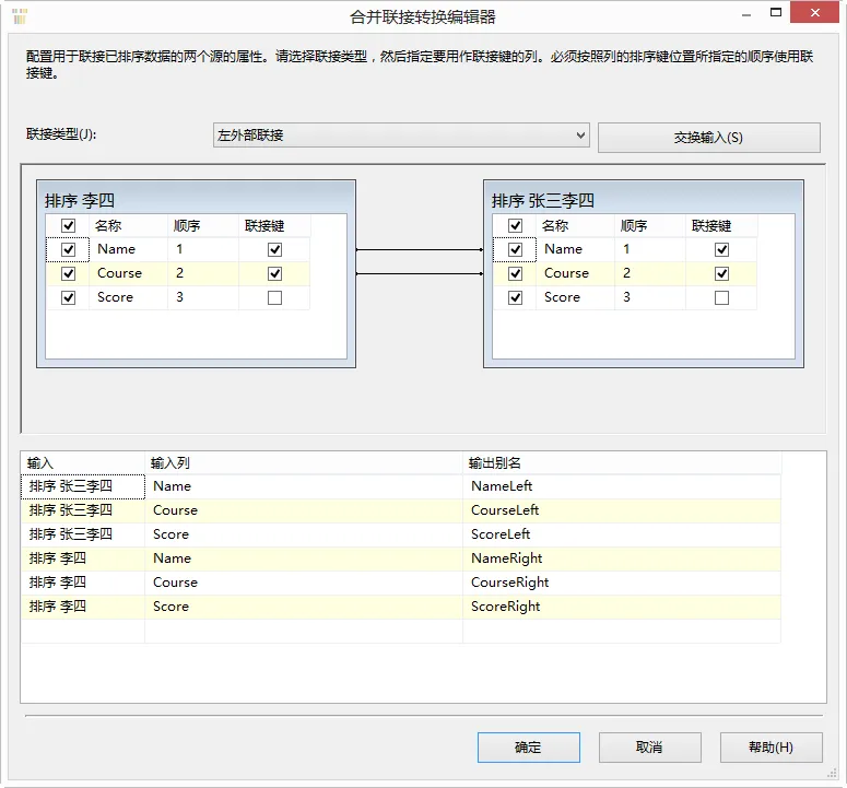 连接类型为:左外部连接。左边为【排序_张三李四】,为第一个输入。