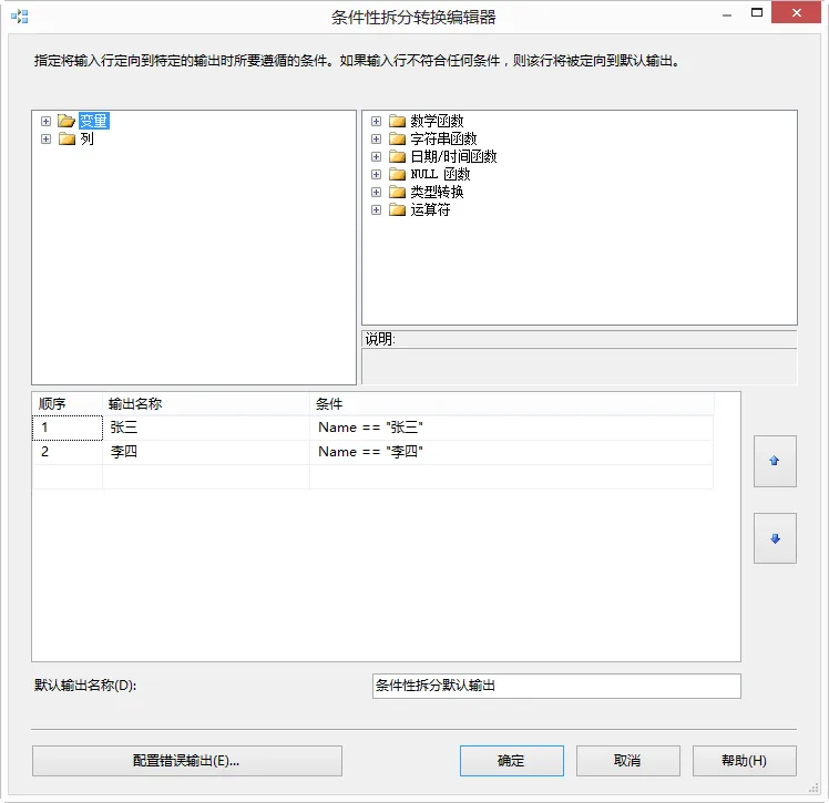 组件【条件性拆分】设置如下,姓名等于“张三” 的和 姓名不等于“张三” 的分别输出到两个多播中。