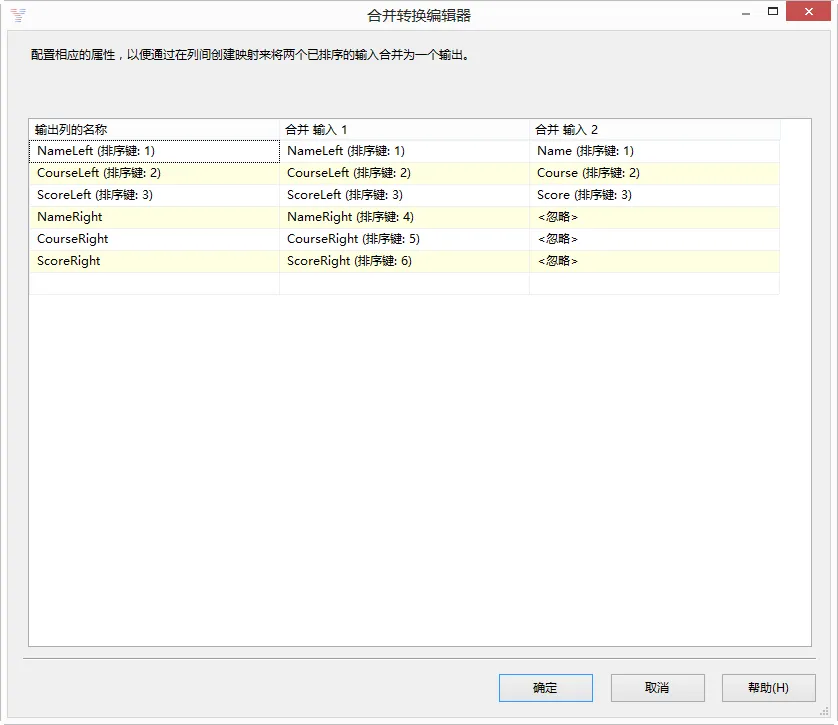 - 合并之前数据必须排序,可以在此之前使用排序转换或者在数据源中使用ORDER BY语句