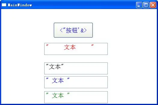 1 <Window x:Class="WpfApplication6.MainWindow" 2 xmlns="http://schemas.microsoft.com/winfx/2006/xaml/presentation" 3 xmlns:x="http://schemas.microsoft.com/winfx/2006/xaml" 4 Title="MainWindow" Height="350" Width="525"> 5 <Grid> 6 <Button Margin="174,45,212,220" FontSize="20" Foreground="Blue"><"按钮'&></Button> 7 <TextBox Margin="143,110,163,161" Height="40" FontSize="20" Foreground="Red" xml:space="preserve">" 文本 "</TextBox> 8 <TextBox Margin="143,175,163,96" Height="40" FontSize="20" Foreground="Black">"文本"</TextBox> 9 <TextBox Margin="143,221,163,50" Height="40" FontSize="20" Foreground="Blue">" 文本 "</TextBox> 10 <TextBox Margin="143,271,163,0" Height="40" FontSize="20" Foreground="Green">" 文本 "</TextBox> 11 </Grid> 12 </Window>