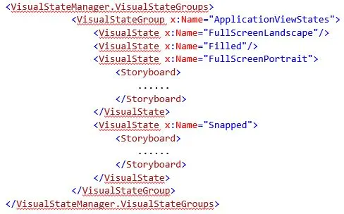 首先监控视图状态更改的代码是隐藏在页面当中的,其中LayoutAwarePage类中注册了当前视图窗口的SizeChanged的事件,并且使用VisualStateManager的VisualState中声明的动画实现视图间的切换。页面VisualStateManager中默认代码如下: