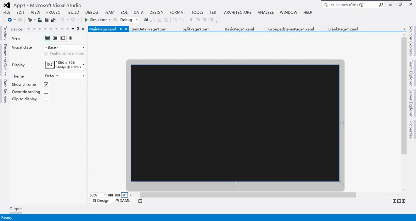 我们可以在VS中通过Device选项卡设置设计器的视图,Device选项卡中可以设置设计器的不同视图、设置Viusal State、Display(显示分辨率)、Theme等功能。