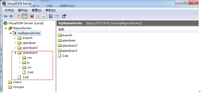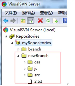点击ok按钮后,就可以在VisualSVN Serval服务器上新增newBranch,是从如上服务器qianduan3上的文件拷贝一份的,如下所示: