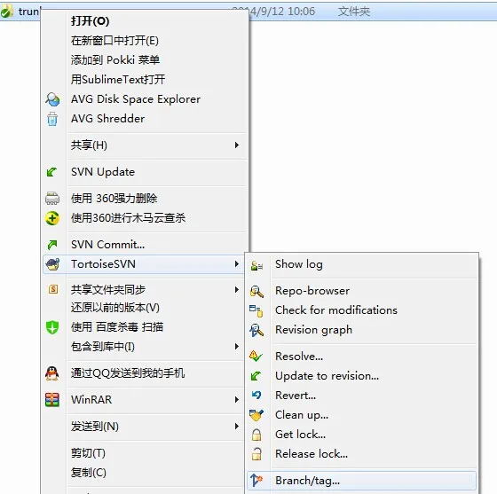 1. 右键trunk --> branch/Tag 如下图: