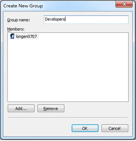 在弹出窗口中填写Group name为Developers,然后点Add按钮,在弹出的窗口中选择Developer,加入到这个组,然后点Ok.