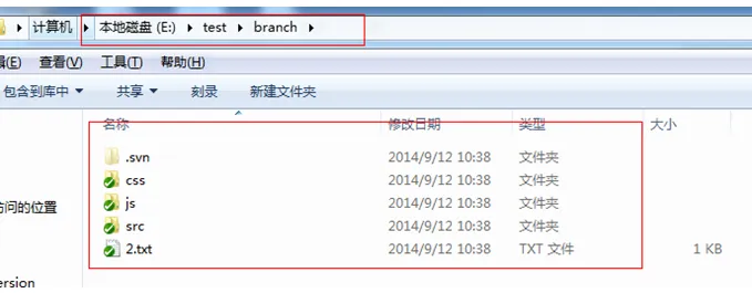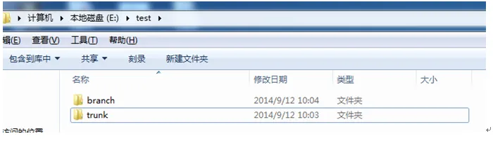 假如我本地新建一个文件夹test下有2个文件夹trunk(存放主干上的代码)和branch(存放分支上的代码),如下所示: