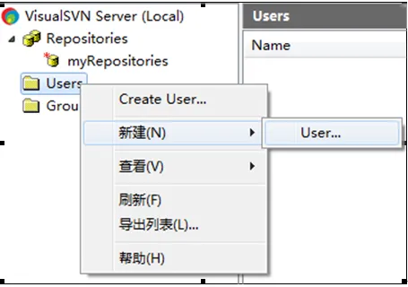 1. 在VisualSVN Server Manager窗口的左侧右键单击用户组,选择Create User或者新建->User,如图: