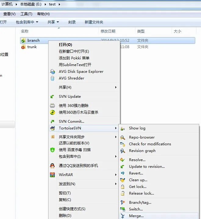 1. 我们在分支点击branch --> 右键TortoiseSVN --> Merge 如下图所示: