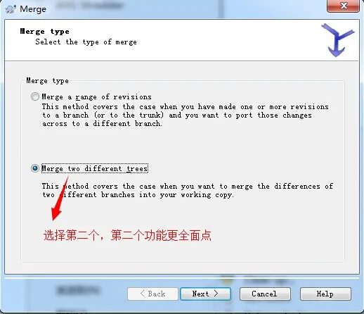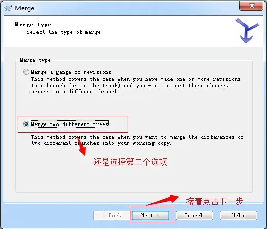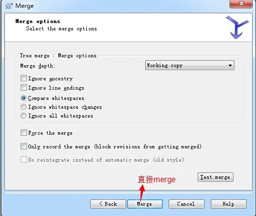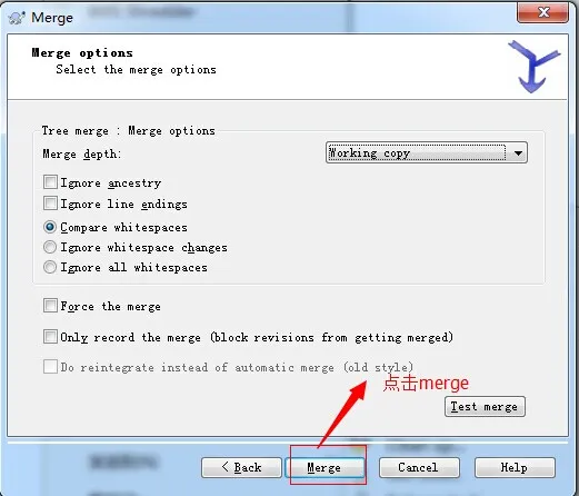 1. 回到我们刚刚的主干(trunk)文件夹下,鼠标右键该文件夹 --> TortoiseSVN --> Merge 如下图所示:
