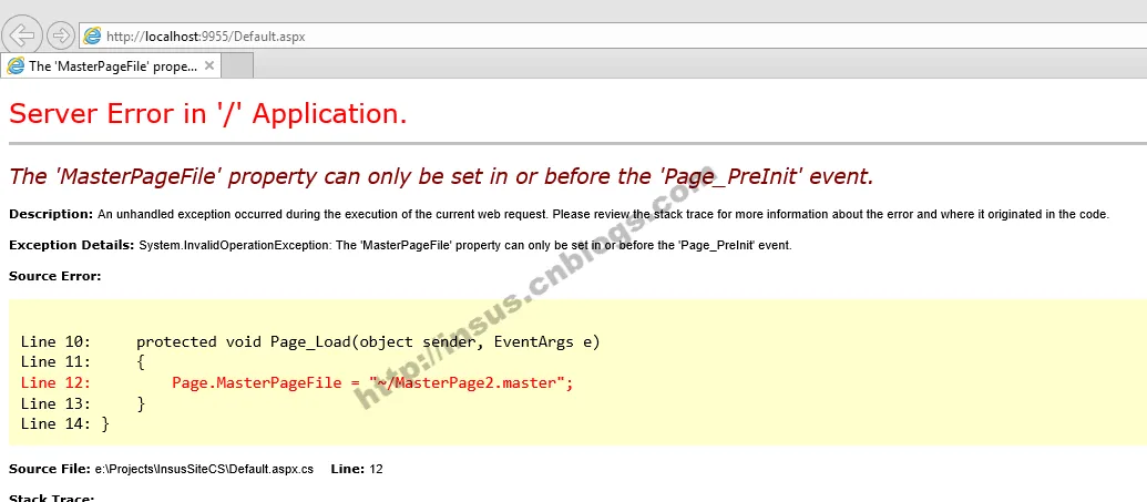 哇,出错了,不过它有提示我们怎样解决的方法,把它移至OnPreInit事件中去,也就是说,动态更新这个属性,是需要在Page_PreInit事件前处理。Ok,