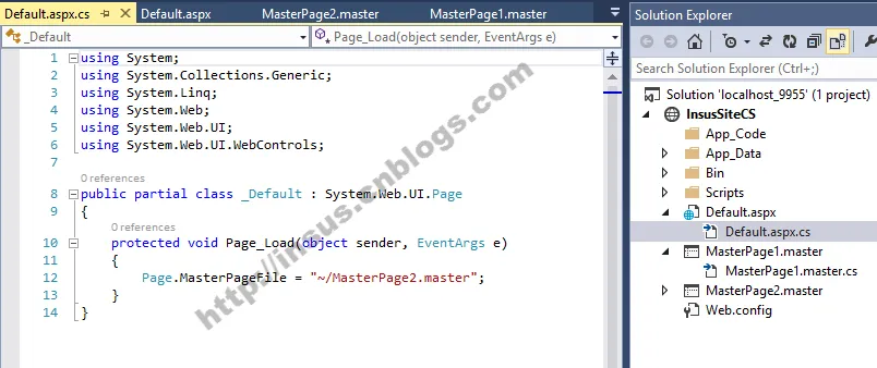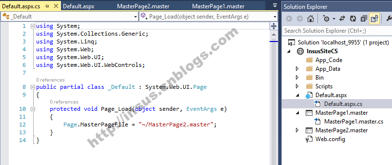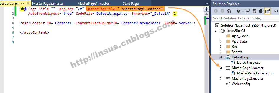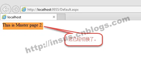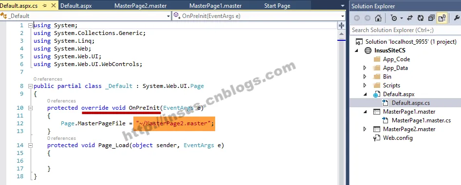 下面是重点,怎样让网页运时,就是能切换至Masterpage2.master去呢,唯一办法,就是动态修改上图中MasterpageFile的值。