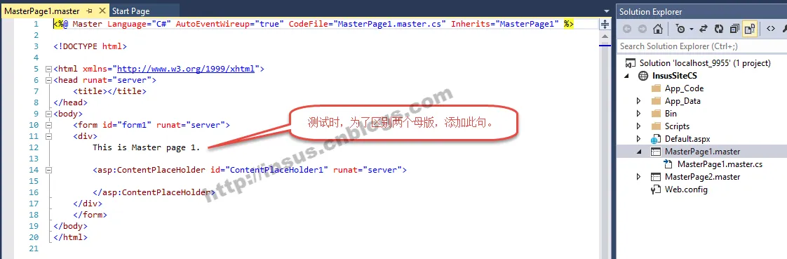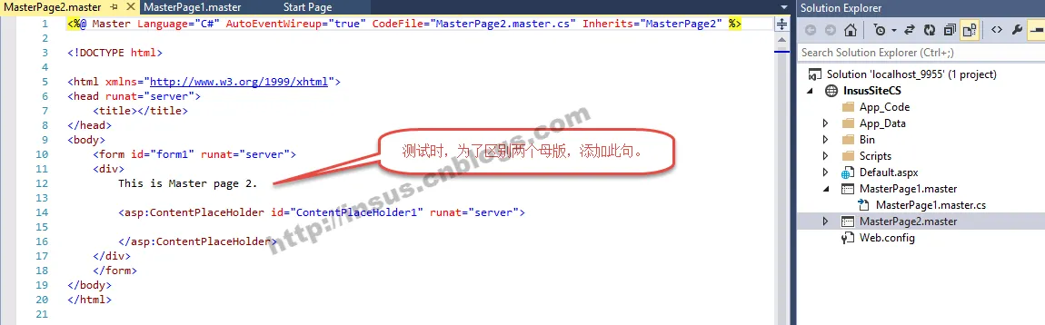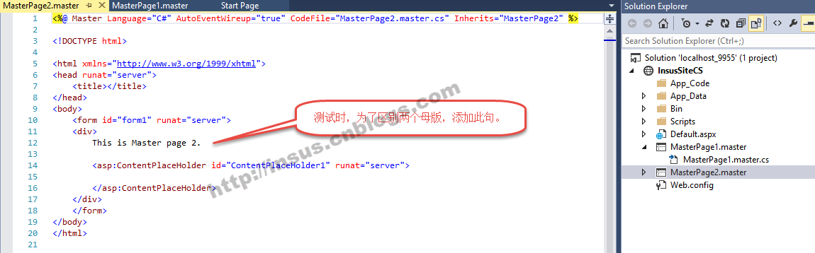 先是在网站上创建两个MasterPage: MasterPage1.master和MasterPage2.master