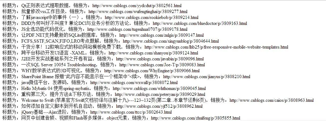 string html = HttpGet("http://www.cnblogs.com/"); HtmlDocument doc = new HtmlDocument(); doc.LoadHtml(html); //获取文章列表 var artlist = doc.DocumentNode.SelectNodes("//div[@class='post_item']"); foreach (var item in artlist) { HtmlDocument adoc = new HtmlDocument(); adoc.LoadHtml(item.InnerHtml); var html_a = adoc.DocumentNode.SelectSingleNode("//a[@class='titlelnk']"); Response.Write(string.Format("标题为:{0},链接为:{1}<br>",html_a.InnerText,html_a.Attributes["href"].Value)); }