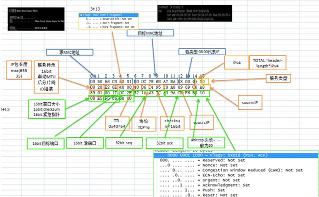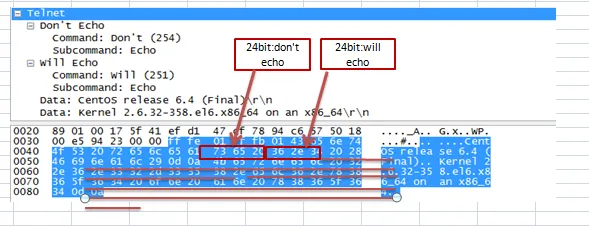 先举例TELNET包,直接上图,不废话。蓝色为二层帧,橙色为三层包,绿色为四层包。四层包大坑在于包长会变。
