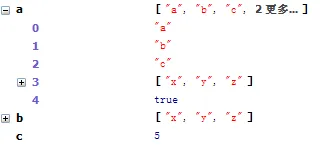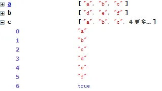 1 var a=["a","b","c"]; 2 var b=["d","e","f"]; 3 var c=a.concat(b,true); 4 document.write(c);