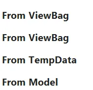 1 <h2>@ViewBag.Show</h2> 2 <h2>@ViewData["Show"].ToString()</h2> 3 <h2>@TempData["Show"].ToString()</h2> 4 <h2>@Model</h2>