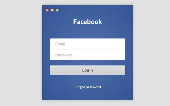 <section class="login-form-wrap"> <h1>Facebook</h1> <form class="login-form" action="POST" action="#"> <label> <input type="email" name="email" required placeholder="Email"> </label> <label> <input type="password" name="password" required placeholder="Password"> </label> <input type="submit" value="Login"> </form> <h5><a href="#">Forgot password</a></h5> </section>