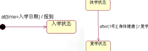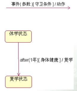 时间事件是经过一定的时间或者到达某个时间后发生的事件。时间事件使用after标识,其格式为: