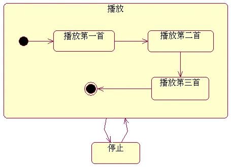 如果一个组成状态的子状态对应的对象在其生命周期内的任何时刻都只能处于一个子状态,也就是说子状态机图中多个状态是互斥的,不能同时存在,这种子状态被称为顺序子状态或叫互斥子状态。在顺序子状态中最多只能有一个初态和一个终态。