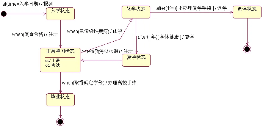 状态机图描述了一个对象在生命周期内所经历的各种状态,以及引起状态变化的事件。