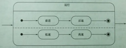 有时组成状态有两个或多个并发的子状态,此时称组成状态的子状态为并发子状态。并发子状态能说明很多事发生在同一个时刻,为了分离不同的活动,组成状态被分解成区域,每个区域都包含一个不同的状态机图,各个状态机图在同一时刻分别运行。