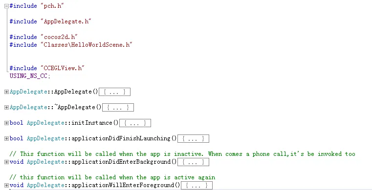 AppDelegate.cpp源文件中包含AppDelegate.h头文件,在其中实现头文件中声明的方法。