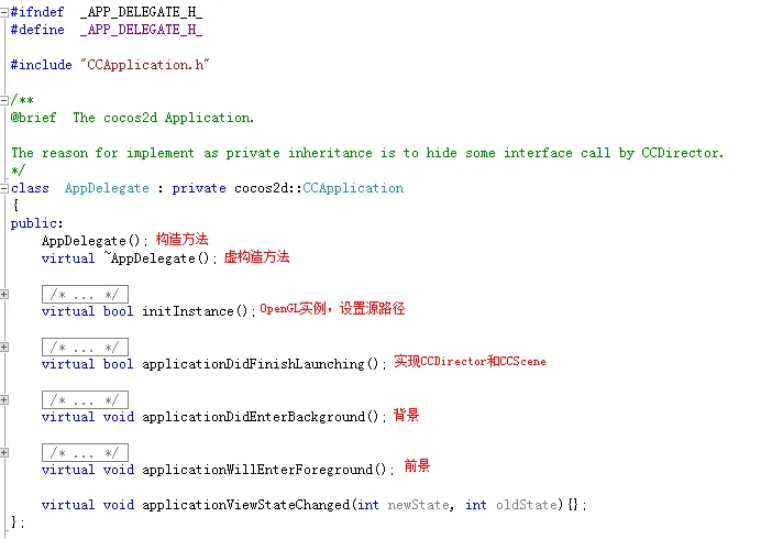 AppDelegate.h头文件中,定义类(Class)AppDelegate继承CCApplication。在AppDelegate中声明相关方法。