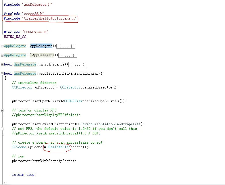 其中在方法applicationDidFinishLaunching中,我们找到了熟悉的CCDirector(导演),当中pScene为起始页面。很显然HelloWorld类,需要在AppDelegate.cpp中引用Classes文件夹中的HelloWorldScene.h头文件(fei话,呵呵)。