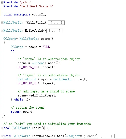 1 bool HelloWorld::init() 2 { 3 bool bRet = false; 4 5 do 6 { 7 if ( !CCLayer::init() ) 8 { 9 break; 10 } 11 this->setIsTouchEnabled(true); 12 13 CCSize screenSize = CCDirector::sharedDirector()->getWinSize(); 14 15 // 1. Add a menu item with "X" image, which is clicked to quit the program. 16 17 // Create a "close" menu item with close icon, it's an auto release object. 18 CCMenuItemImage *pCloseItem = CCMenuItemImage::itemFromNormalImage( 19 "CloseNormal.png", 20 "CloseSelected.png", 21 this, 22 menu_selector(HelloWorld::menuCloseCallback)); 23 CC_BREAK_IF(! pCloseItem); 24 25 // Place the menu item bottom-right conner. 26 pCloseItem->setPosition(ccp(CCDirector::sharedDirector()->getWinSize().width - 20, 20)); 27 28 // Create a menu with the "close" menu item, it's an auto release object. 29 CCMenu* pMenu = CCMenu::menuWithItems(pCloseItem, NULL); 30 pMenu->setPosition(CCPointZero); 31 CC_BREAK_IF(! pMenu); 32 33 // Add the menu to HelloWorld layer as a child layer. 34 this->addChild(pMenu, 1); 35 36 // 2. Add a label shows "Hello World". 37 38 // Create a label and initialize with string "Hello World". 39 CCLabelTTF* pLabel = CCLabelTTF::labelWithString("Hello World", "Arial", 24); 40 CC_BREAK_IF(! pLabel); 41 42 // Get window size and place the label upper. 43 CCSize size = CCDirector::sharedDirector()->getWinSize(); 44 pLabel->setPosition(ccp(size.width / 2, size.height - 50)); 45 46 // Add the label to HelloWorld layer as a child layer. 47 this->addChild(pLabel, 1); 48 49 // 3. Add add a splash screen, show the cocos2d splash image. 50 CCSprite* pSprite = CCSprite::spriteWithFile("HelloWorld.png"); 51 CC_BREAK_IF(! pSprite); 52 53 // Place the sprite on the center of the screen 54 pSprite->setPosition(ccp(size.width/2, size.height/2)); 55 56 // Add the sprite to HelloWorld layer as a child layer. 57 this->addChild(pSprite, 0); 58 59 bRet = true; 60 } while (0); 61 62 return bRet; 63 }